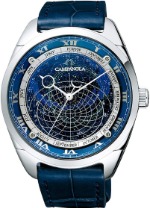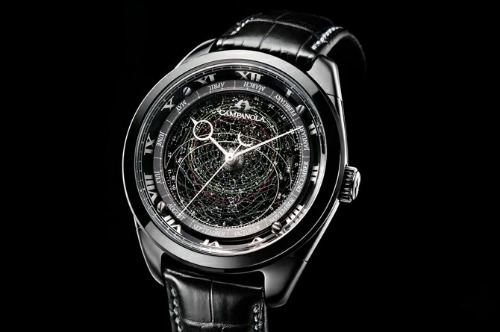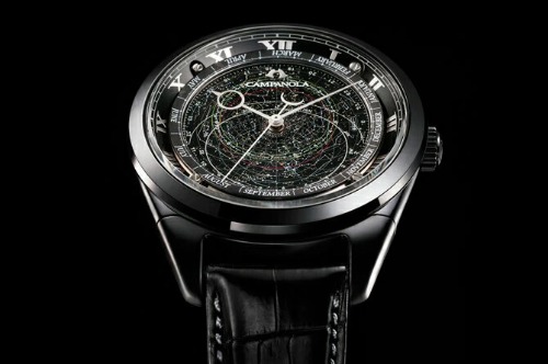 カンパノラコスモサインは星座盤モデルと月齢盤モデルの2種類からなり、星座盤モデルは北緯35度で見える恒星と星雲、星団を精密な印刷で文字盤上に表示し、時刻にあわせて時計と逆方向に回転、リアルタイムの星座を正確に表示します。