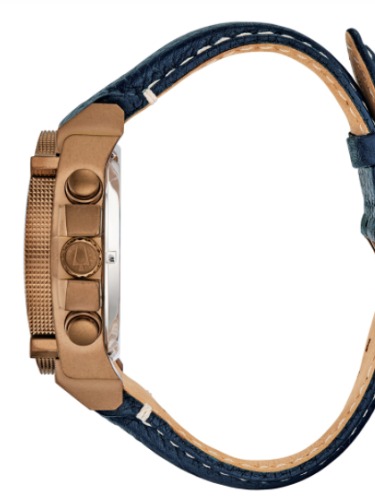 濃紺のカーフレザーとブロンズ加工のステンレススチールがカジュアルでゴツい雰囲気をかもしています。