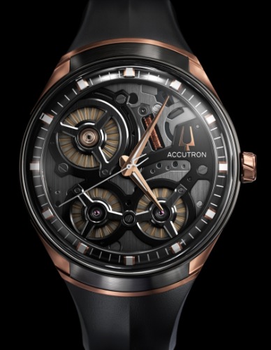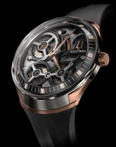 ローズゴールドのケースと、時針の奥に見えるムーブメントが機械的なデザインと形容したくなるブローバ97A111 AccutronⅡ。