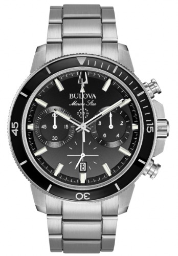 ブラックカラーの文字盤とシルバーのベルトが高級感を漂わせる腕時計、ブローバ96B272 Marine Star。