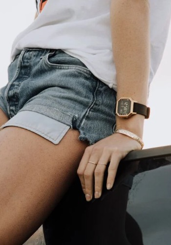ケースは特徴的ですが、ブラックとゴールドのみで構成されているのでさまざまなコーディネートで活躍します。