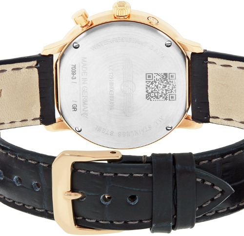 幾何学的な模様が魅力的なムーンフェイズの腕時計です。シルバー無垢製のダイヤルと青焼きしたスチール製の針が美しい腕時計です。ムーブメントが手巻きという点から時計好きからも人気です。手縫いのアリゲーターストラップも落ち着きのある高級感を演出し、大人の魅力を引き立ててくれます。