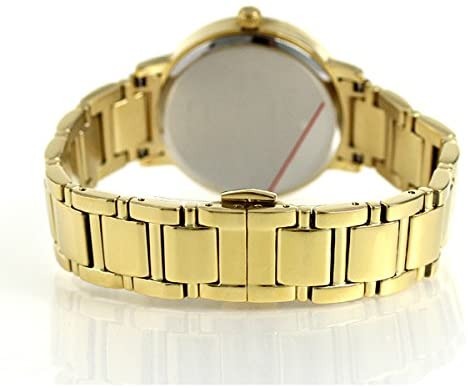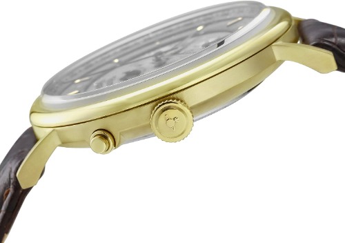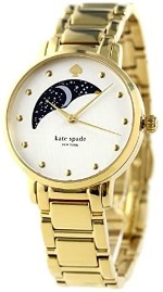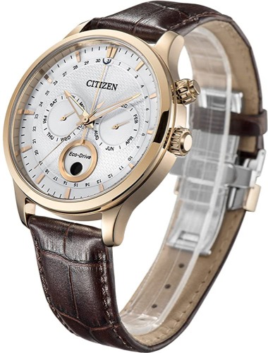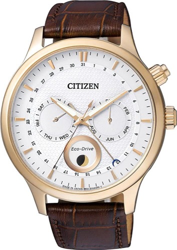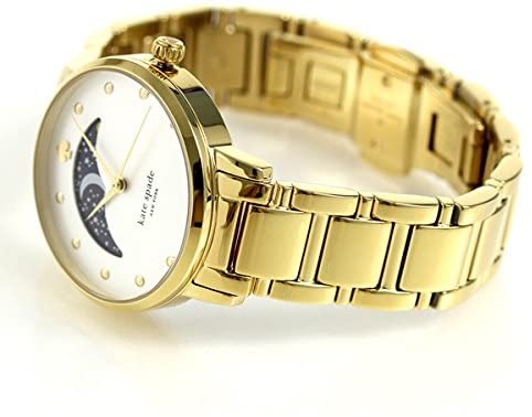 ベゼルや竜頭(リューズ)などは黄色系統の色ですが、白銅色に近い文字盤と涅色のようなベルトが腕時計に落ち着きを与えて若々しいけれど大人びた雰囲気を持たせています。精度の高いクォーツ式のムーンフェイズの腕時計で、買い求めやすい値段となっています。
