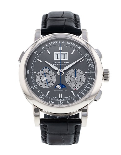 全体的に暗めの色で統一されたムーンフェイズの腕時計です。ブラックやグレーの中にあるシルバーが、夜と月のイメージを強くする腕時計です。夜光塗料が使われているので、夜の時間の確認が楽にできます。ダトグラフ・パーペチュアルRef.410.038は、他のモデルと比べて比較的お手頃価格となっています。まずはランゲ&ゾーネの腕時計を試したいという人におすすめです。