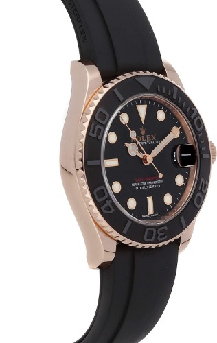 こちらのモデルは2019年から製造開始されたロレックスのあたらしいヨットマスターです。ベゼルの素材には高級感のあるブラックの光沢が美麗で目を引くマットブラックセラミック製で、仕上げられたセラクロムベゼルインサートが採用されています。ムーブメントは新世代のCal.3235を備えており、耐磁性や耐衝撃性などが高い性能で約70時間ほどのリザーブが可能です。