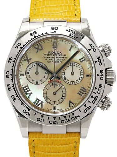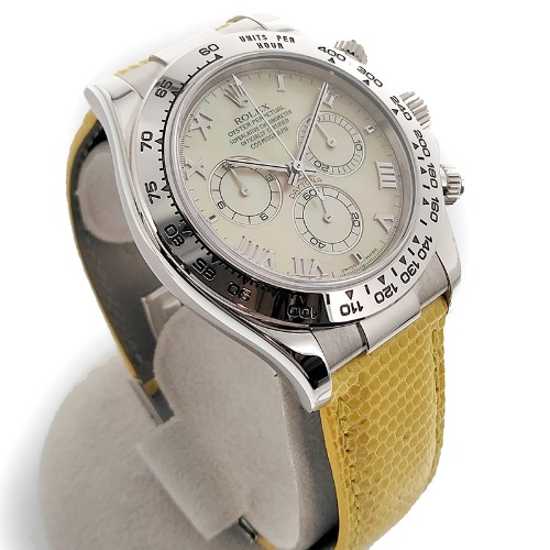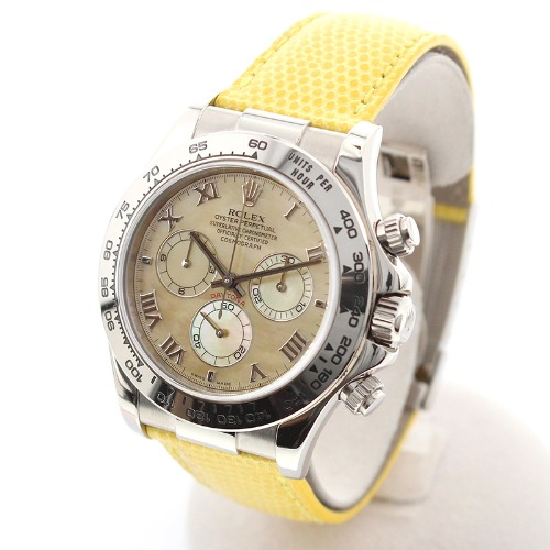 イエローシェルを文字盤に使用したデイトナビーチ イエローは、光の加減で色合いが変化する美しいモデルです。