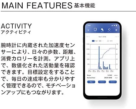 1日の歩数や消費カロリーの確認などスマートウォッチとして基本的な使用方法の他、バンド部分に搭載されたFeliCaで電子マネーも使用可能です。