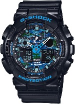 GA-100シリーズの特徴のシンメトリーデザインと、ミリタリーテイストのブルーの迷彩柄が相性も良いG-SHOCK、GA-100CB-1AJFです。