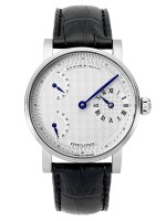 シンプルなステンレススチールケースに自社製手巻きムーブメントCAL.SW-07を搭載し、ギョーシェ彫りが美しいホワイトダイヤルに華奢なデザインの時針・分針とローマ数字のインデックスが絶妙に調和しています。