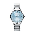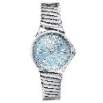 アイスブルーの文字盤が美しい、ステンレススチール製の時計です。