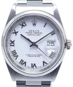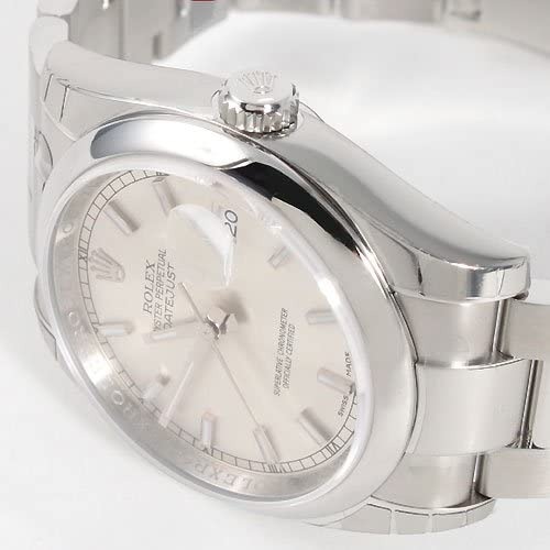 評価:ローマ数字のインデックスが瀟洒で美しいです。何しろロレックスですから品質は申し分ありません。明るい照明下だと時間がはっきり認識しやすい。ただしローマ数字のため夜光塗料は塗られていません。真っ暗闇お手上げ。シンプルデザインなので操作は簡単、オイスターケースは頑丈です。