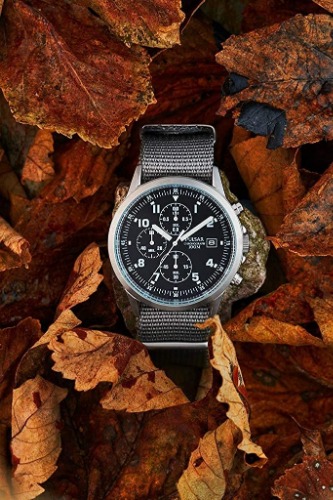 ブラックダイヤルにホワイトのインデックスで視認性抜群のミリタリー海外モデルで、縦目のダイヤルデザインがクロノメーターと調和して上品な仕上がりです。