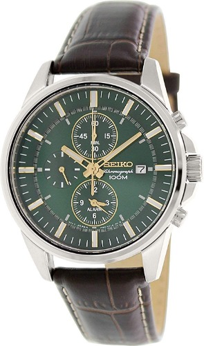 評価:このもによりますが、写真より実物のほうが華やいで美しいです。グリーンの文字盤は、お洒落で質感のよさも感じさせます。機能的には使いやすいアラーム機能があって、文字盤の6時の位置にアラームセット用の指針を配置しています。ゴールドのSEIKOのエンブレムがさりげなく信頼感を生み出しているようです。