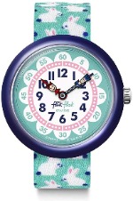 バンドの白いウサギと盤面のキャラクターが特徴のスウォッチのキッズ(子供用)モデル、FBNP151を紹介します。