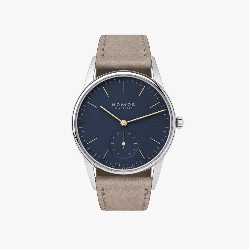 ノモスオリオン33ミッドナイトブルーOR1A3BL133は濃紺のようなシックなブルーの文字盤とベージュカラーのベルトが特徴。