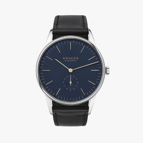 深夜の漆黒の闇のような深みのあるブルーの文字盤がシックな印象を与えてくれるノモスオリオン38ミッドナイトブルーOR1A3BL138。