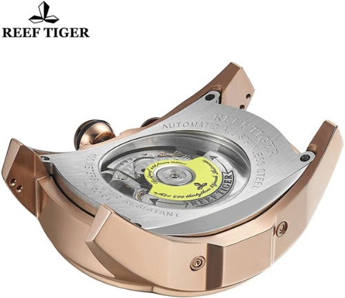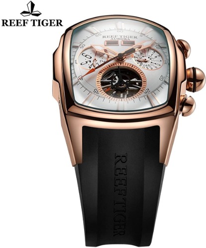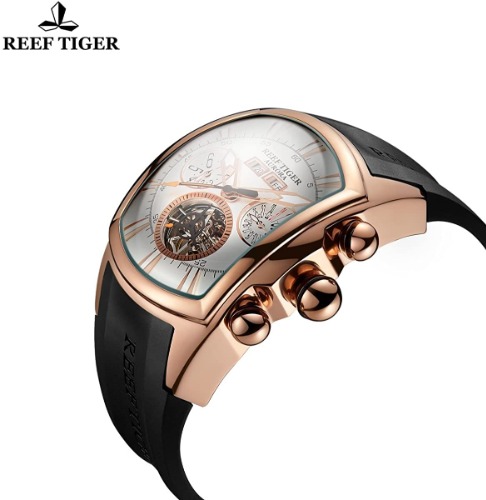 Reef Tigerから発売されている「ピンクゴールドトゥールビヨン(RGA3069-PBB)」は、長方形のケースが特徴的で唯一無二なデザインです。