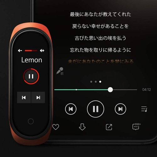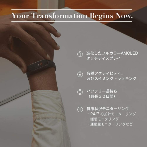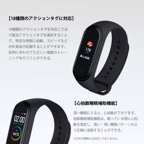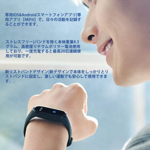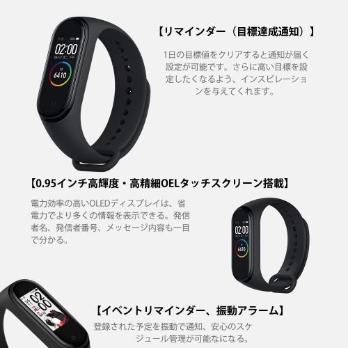 Xiaomi MiBand4は、シンプルな黒いブレスレット型タイプのスマートウォッチです。
