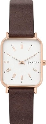 スカーゲンの四角いゴールドのケースは上品で、インデックスにはローマ数字が使用されているので、モダンなデザインの女性用腕時計となっています。