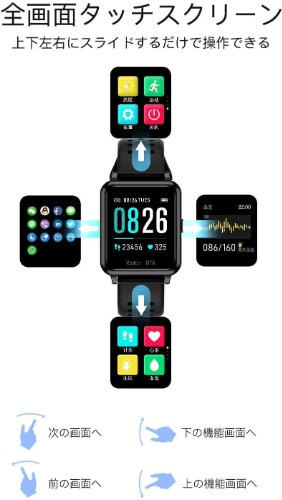 評価:1週間使ってみて、スマートウォッチの評価は 多機能、大画面で通知を見過ごさず便利に使えて満点。タッチセンサーは画面のどこでも反応します。画面点灯時に上下左右にスワイプすると画面を切り替えることができます。上にスワイプすると届いた通知メッセージの閲覧・削除ができます。