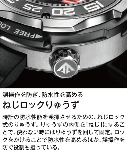 エコドライブプロフェッショナルダイバー1000mはISO/JIS規格に適合しており、飽和潜水1000mを実現し、ガラスを保護するために10時の位置にヘリウムガス排気バルブを搭載しています。