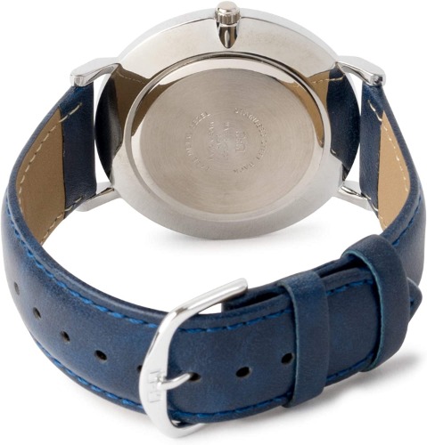 大きめの文字盤に、ブラックとブルーのツートンカラーがアクセントになっています。