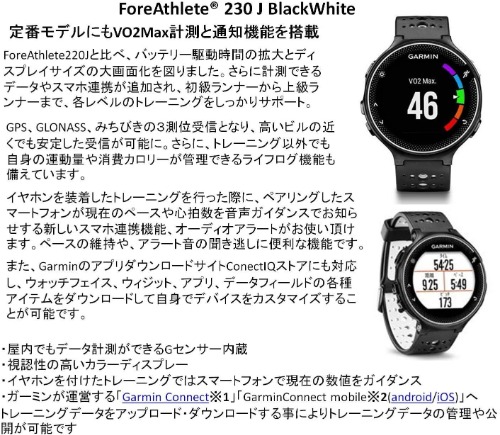 ガーミン(GARMIN) のForeAthlete230JはVO2Max計測と通知機能を搭載しているモデルです。
