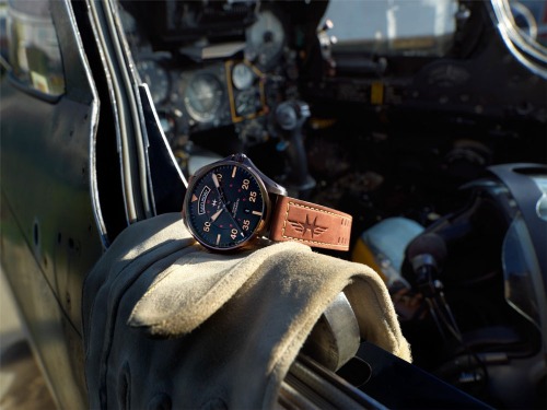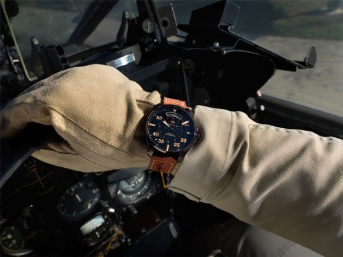 古き良き時代を思わせるような存在感を放ちつつ、シースルーのバックデザインを施すなどヴィンテージ的な部分とイノベイティブな部分とを併せ持つ、広い用途に用いる事の出来る人気のカレンダーと日付機能付きパイロットウォッチになります。
