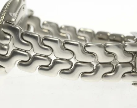 独特な形をしたベルトのコマが特徴で、手首への装着感は他に類を見ないでしょう。