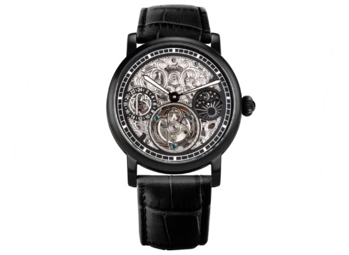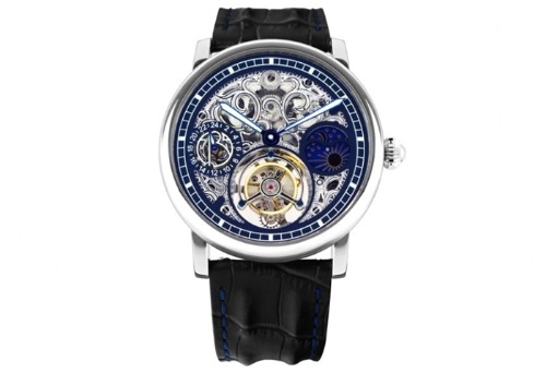 ゲージタイプのインデックスによりダイヤルは広々としており、トゥールビヨンの動きや美しい中空彫刻、ギアの動きなどを楽しめるモデルです。