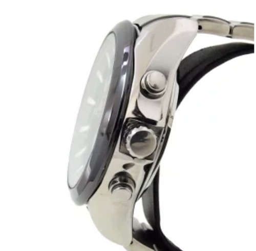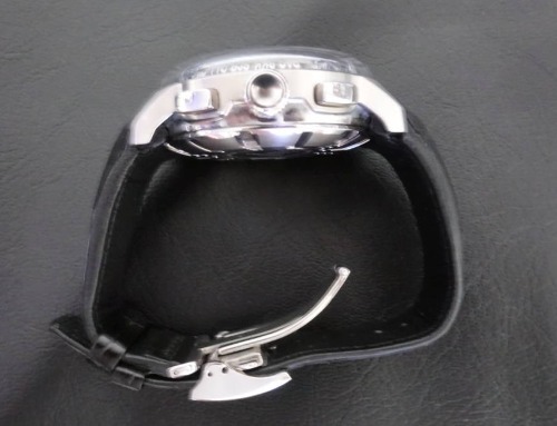 評価:クロノグラフの針が赤く塗られていてアクセントカラーになっている。視認性がとってもよくて目の悪い人でも色合いで時間が分かる。ただスポーティーなだけでなく、ベルトの真ん中がブラックになっていてエレガントさもあって気に入っている。