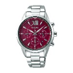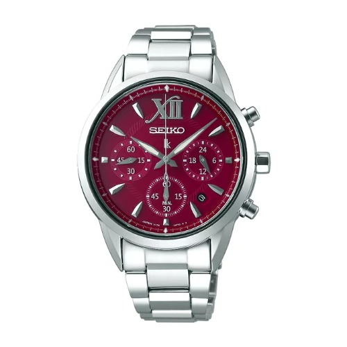 ルキア SSVS039は、ボルドーワインのような深い色合いの文字盤に、羽ペンで書いたような書体のローマンインデックスが入ったクロノグラフです。