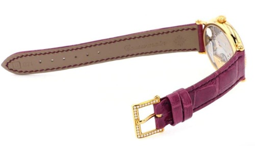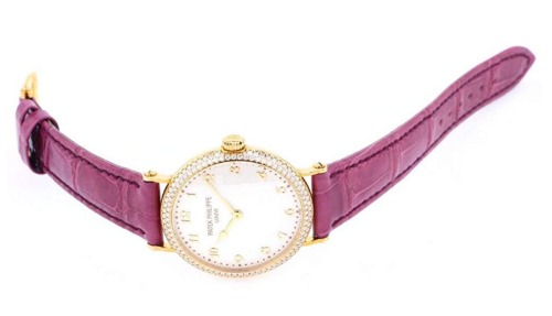 ベゼルにはダイヤモンドが装飾されていて、パープルカラーのレザーベルトで全体的にフェミニンな印象があるレディースモデルのパテックフィリップ時計です。ダイヤは装飾されていますが派手すぎない可愛らしいデザインなので、ビジネスシーンにもフォーマルなシーンにも合うので日常使いができる腕時計です。