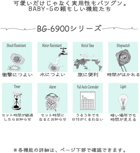 評価:デザインは写真通り素敵で、着け心地もいいです!文字盤の大きさも丁度良く見やすいのに、G-SHOCK特有の「ごっつさ」がなく、可愛くキュートで気に入りました。また、時計の入っていた缶もBABY-Gのロゴ入りオリジナルで超かわいいです!