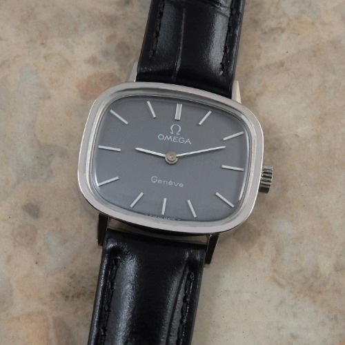 スクエアケースに丸いフェイスが組み合わさった、大人可愛いオメガのアンティーク時計です。