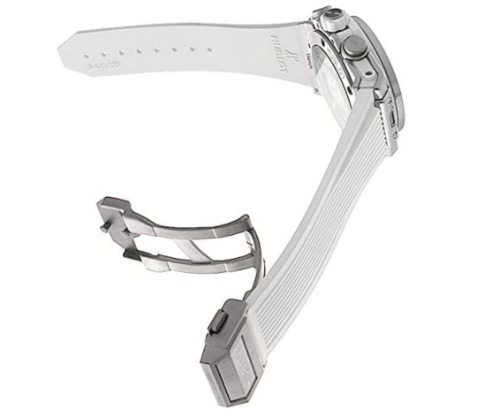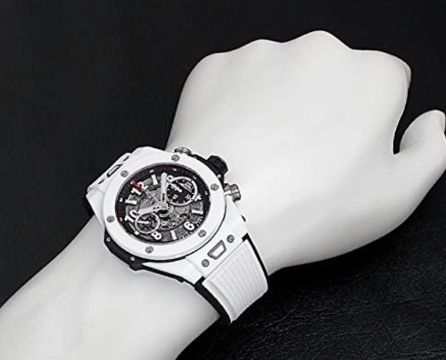メタル感があるデカ厚なビッグバンウニコのメンズ時計です。ホワイトカラーのラバーベルトで清潔感があります。世界中の多くの男性から支持されているモデルの一つです。