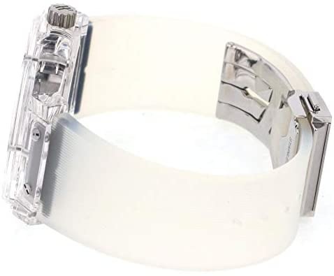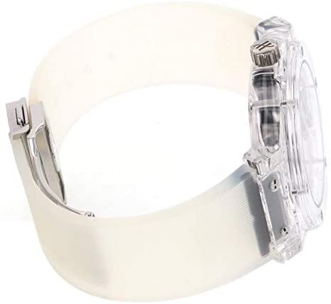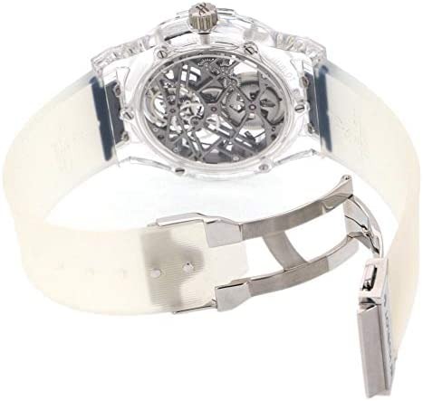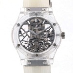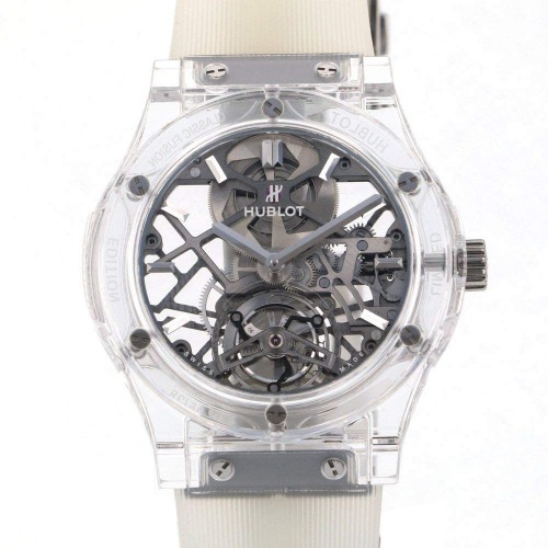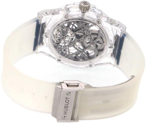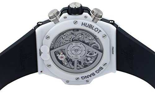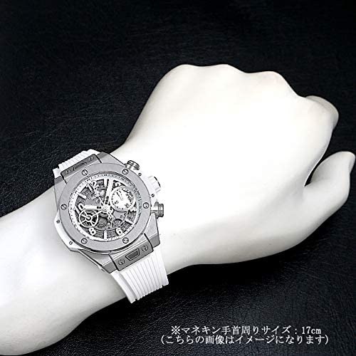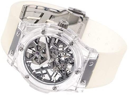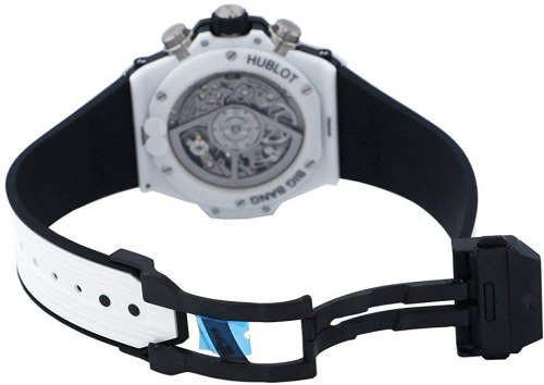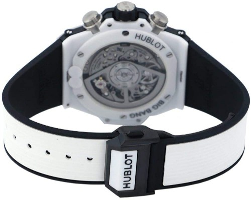 ホワイト&シルバーの組み合わせも印象的ですが、高級クロノグラフのHUB1280が搭載されている上に、両面スケルトンデザインです。