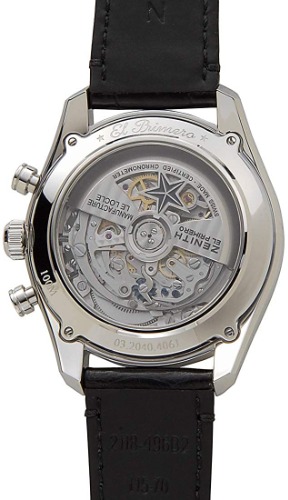 シースルーバックデザインなので、ゼニスのムーブメントを後ろから眺めて楽しむことができる腕時計です。