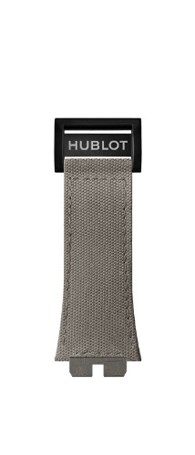 キャンバス地とカーフ本革の組み合わせです。キャンバス地のカラーはご紹介しているグレーのほか、レッドやブルーなどがあります。キャンバス地とカーフの組み合わせは斬新なようで、実は日本人にもおなじみ。着け心地もよく人気があります。異素材のフュージョンが得意なウブロらしく、キャンバス地とカーフのバランスは抜群です。