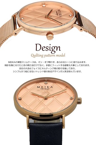 MEIKA001流通限定モデルでもあり、キルティングデザインのダイヤルが個性的で大人の上品さを演出できる腕時計です。