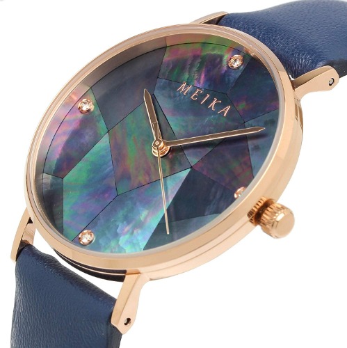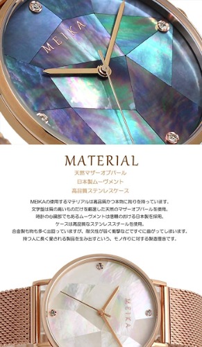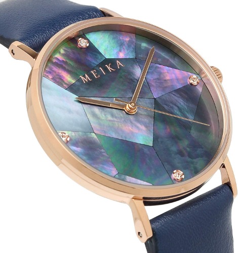 MEIKA002-BKRG-NVは美しい輝きを放つ多面カットの天然のマザーオブパールダイヤルが採用されたおしゃれな腕時計です。