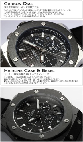 評価:写真で見るよりも立体感のある文字盤ですね。クロノグラフのところの柄がカーボン調。カーボン好きな僕には、この部分も魅力的です。買って良かったと心底思う買い物が出来ました。