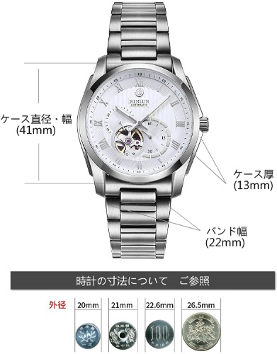 評価:BINLUNと見かけないメーカーですが、ちゃんとしっかり自動巻き。機械式の程よい重量感。かつサファイアガラス、ステンレス無垢の重厚感あるバンド、42mmとちょうどいいケースサイズ。そしてまさかのハック(秒針停止)機能付き。かなりの満足感が得られました。