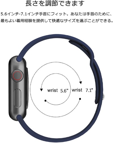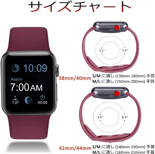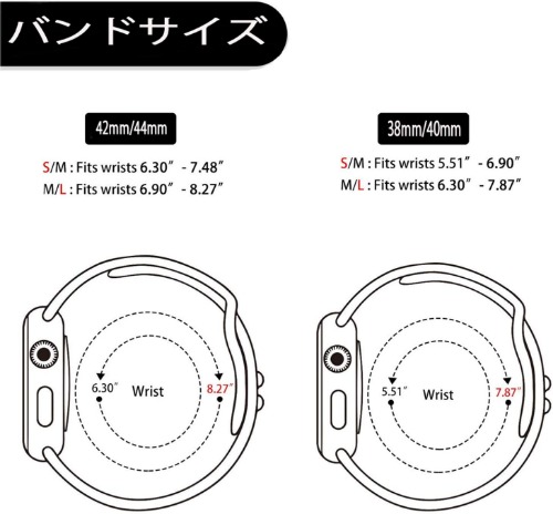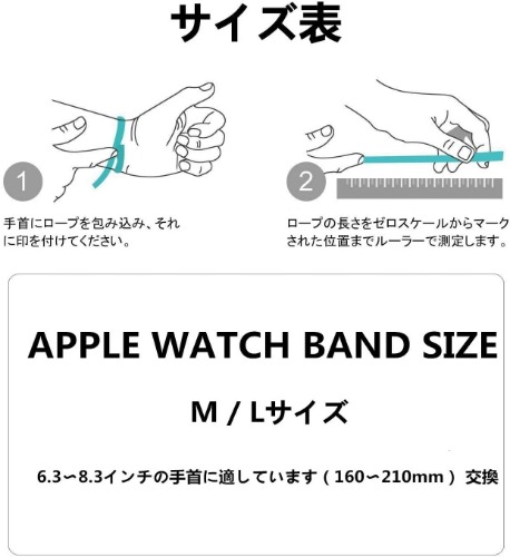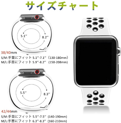 サイズチャートは38mm/40mm S/M:130mm-180mm・38mm/40mm M/L:150mm-200mm・42mm/44mm S/M:140mm-190mm・42mm/44mm M/L:160mm-210mm になっており、対応はApple Watch Series 5/4/3/2/1 になっています。