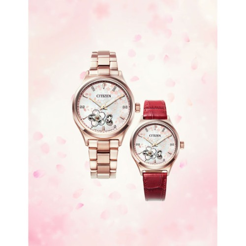レディースサイズながら、小さなダイヤルには桜の形に切り込みが入れられており、中のムーブメントが見えるように工夫されています。