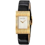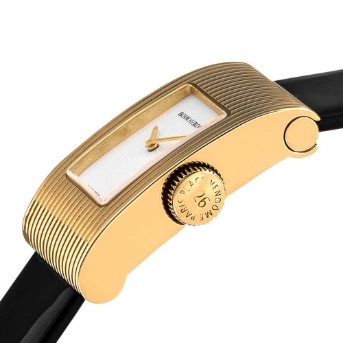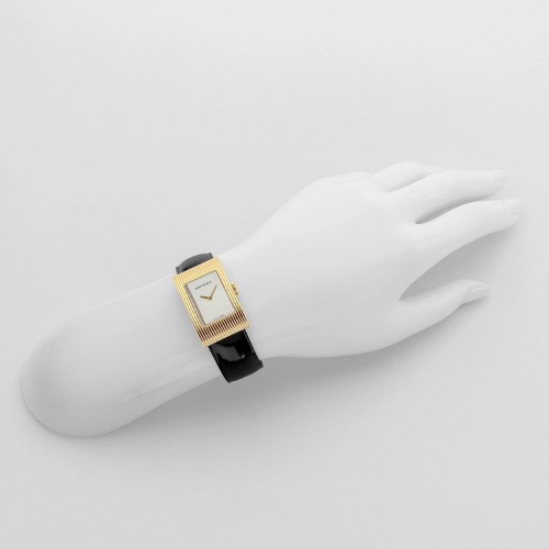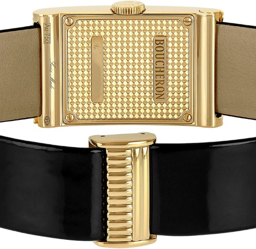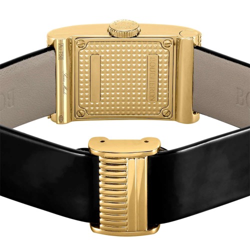 18Kゴールドをスクエアに加工したケースが優美なシェイプを見せ、レザーベルトは世界初のインターチェンジャブルストラップによって簡単に付け替えができます。