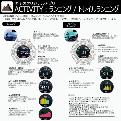 高度や気圧、方位などを計測できるアウトドアスポーツウォッチで、ランニング時以外にも登山やアウトドアシーンで活躍します。