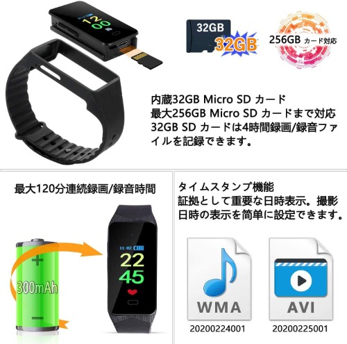 評価:パソコンで日付と時計の表示を設定しました。奥のボタンで録画で画面に赤いハートがついて手間のボタンで録音で画面に黒いハートがついて。とにかく操作が簡単です。ボタンは画面と横の2つだけ!揉め事や口論の時に言った言わないの証拠撮りに。再生はWindows10のパソコンで大丈夫でした。