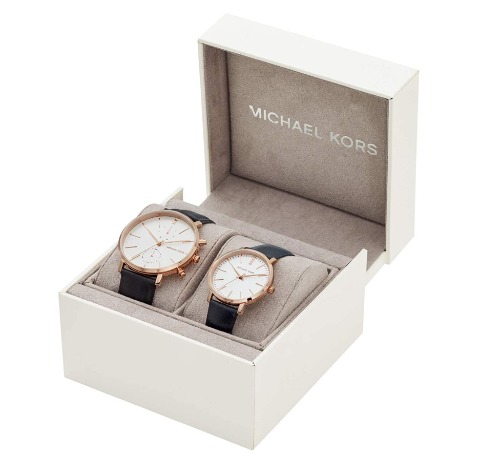 ホワイトカラーの文字盤にゴールドカラーのケース、そして着け心地抜群のレザーベルトが使用されているシンプルで上品なマイケルコースのペアウォッチです。