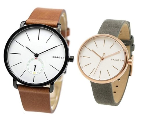北欧にあるデンマークの時計ブランドSKAGEN(スカーゲン)から発売されている、スタイリッシュで幅広いファッションに合わせることができるペアウォッチです。メンズモデルはブラウンレザー、レディースモデルにはグリーンカラーのレザーベルトが使用されています。